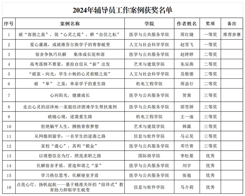 为进一步推动我校辅导员队伍专业化、职业化建设,提升辅导员专业能力,学生工作处面向学生管理队伍组织了工作案例征集活动,各学院积极组织辅导员参与。学生处组织评审团队,根据主题鲜明、内容真实以及文本规范三个角度评选出16篇优秀工作案例。