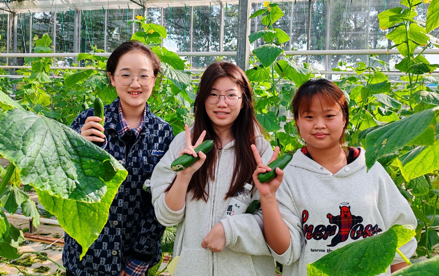 除了手动割稻、脱谷体验,学生们还走进四季温室大棚采摘黄瓜,学生们仔细观察黄瓜的生长环境,了解黄瓜的不同部位,如叶子、花朵和果实。通过亲手采摘和观察,不仅增长了知识,还体验到了劳动的快乐和收获的喜悦。