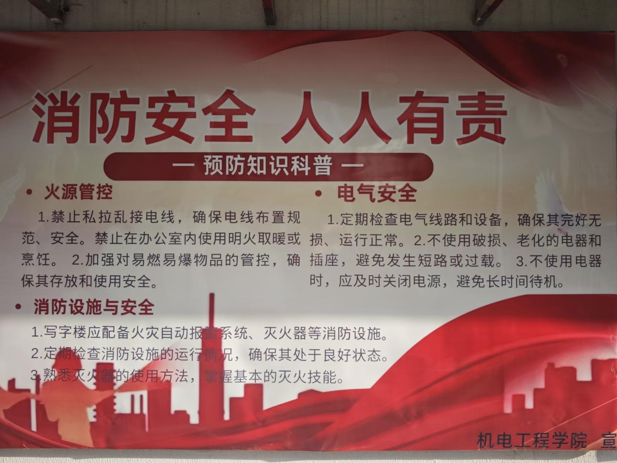 每年11月9日是全国消防日,为了进一步增强师生的消防安全意识,提高自救互救能力,机电工程学院举办一系列消防宣传和培训活动,普及消防安全知识,提高全院师生的消防安全意识,增强应对火灾等突发事件的能力,增强校园整体的安全氛围。