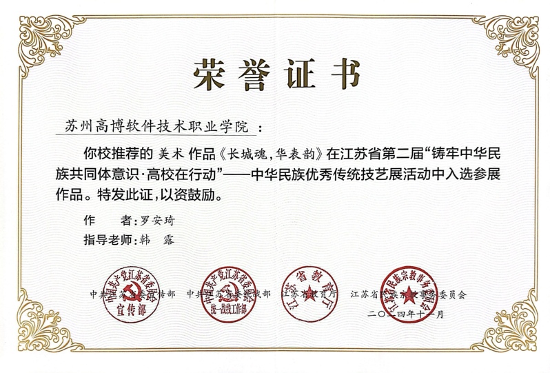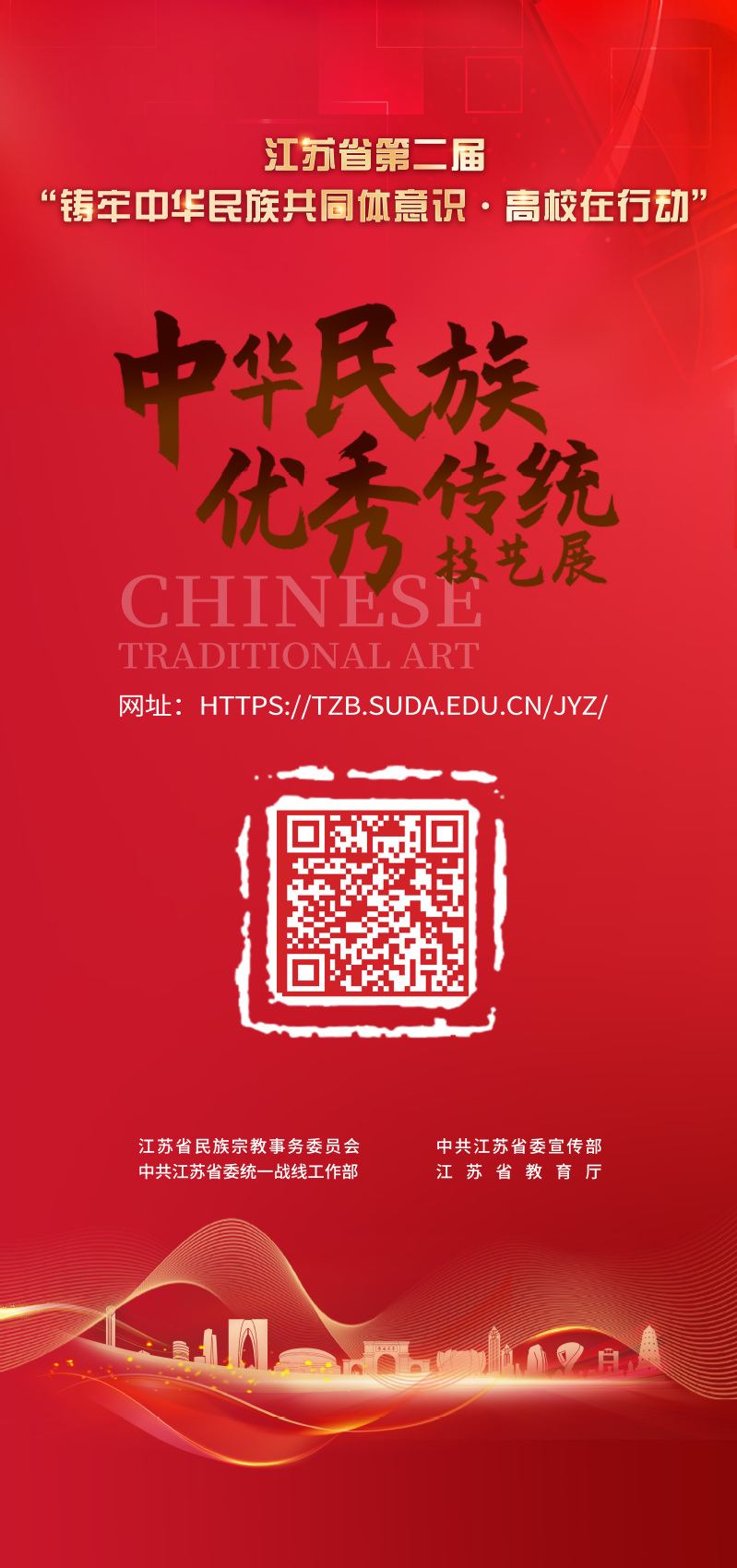 我校推荐的编制作品《龙凤呈祥》、美术作品《向阳而生》、美术作品《长城魂,华表韵》入选江苏省第二届“铸牢中华民族共同体意识·高校在行动”——中华民族优秀传统技艺展。