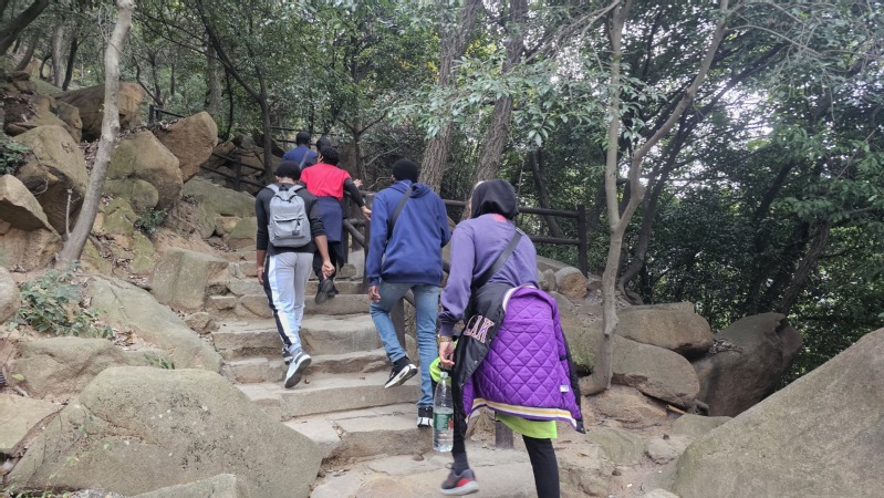 天平山有“天平红枫甲天下”之誉,其以怪石、红枫、清泉并称“天平三绝”而名闻天下。初冬的天平山层林尽染,霜叶如花艳丽的色彩在秋风中渲染开来。留学生们拾阶而上,沿着延绵不断的山路,眼看着山路无穷,却又柳暗花明,豁然开朗。同学们沉浸于登山之乐,尽情呼吸着清新的空气,感受爽劲的山风,远处的姑苏城美景尽收眼底,美不胜收。在远离喧嚣的宁静里,以一身疲累,换得了心灵的休整与放松。