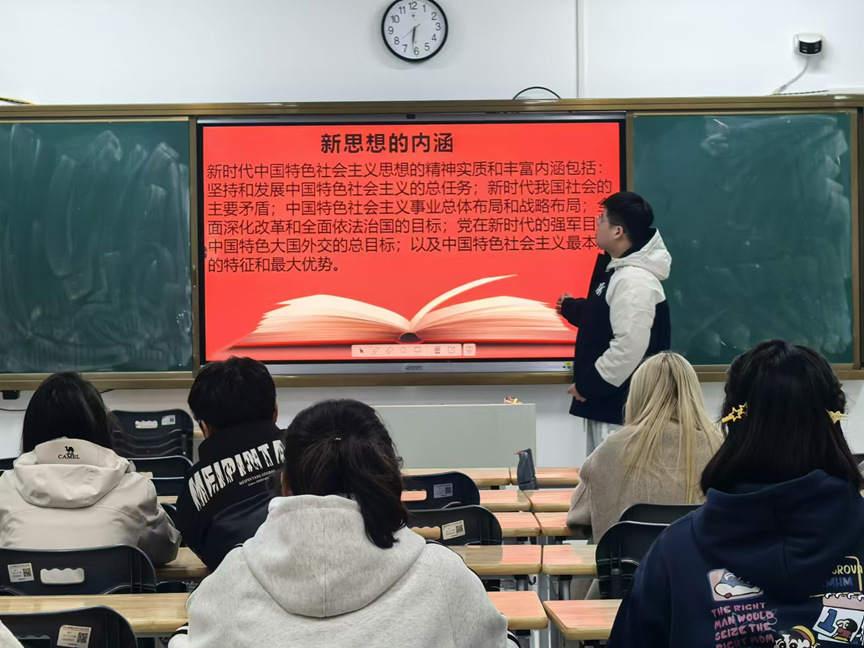 在新时代的伟大征程中,思想的力量始终是推动社会进步和发展的重要引擎。2024年11月19日晚上6时30分,国际商学院分团委在32-306精心组织了一场以“新时代·新理念·新动力”为主题的新思想公开课。本次公开课由国际商学院学生会志愿服务部部长李嘉俊同学担任主讲,国商2024级全体团员学生参与课堂。