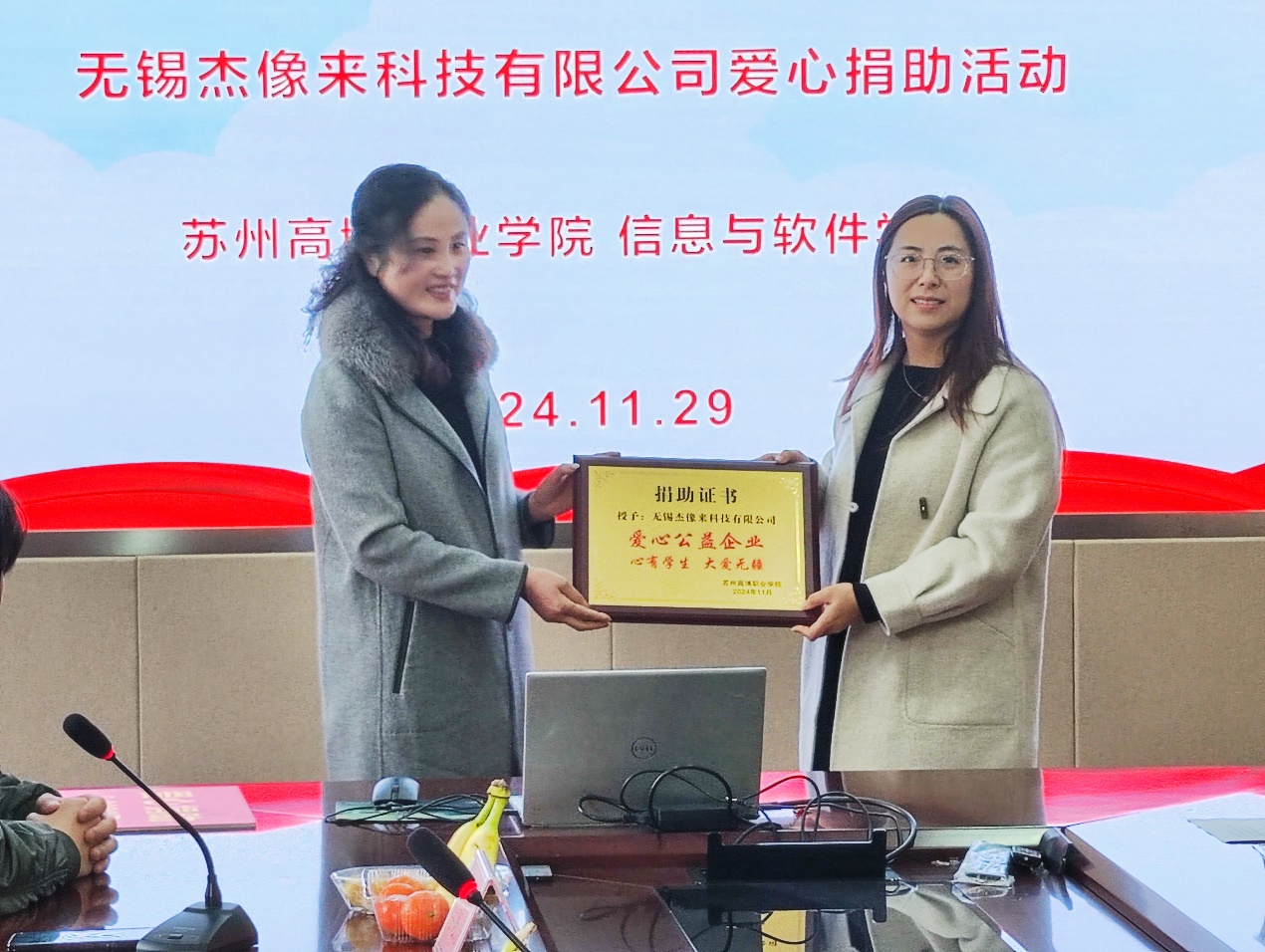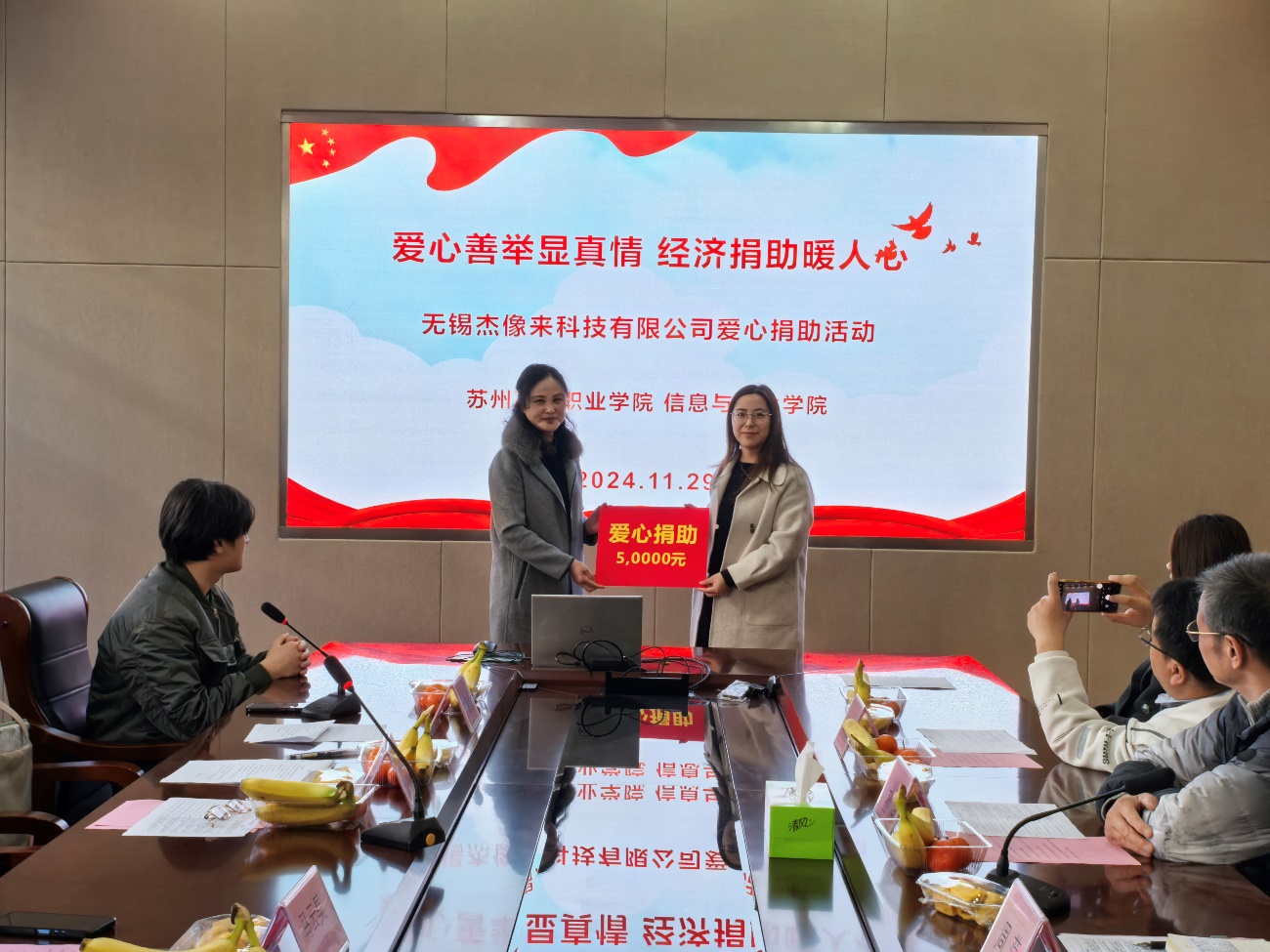 11月29日,无锡杰像来科技有限公司向高博职业学院信息与软件学院捐助五万元,资助我校信息与软件学院经济困难学生,捐助仪式在我校行政楼一楼会议室举行。学校学生处周处长,信息与软件学院党组成员,受助学生参加了爱心捐助,捐助活动由信息与软件学院李嫚嫚老师主持。