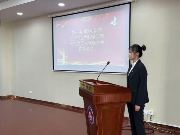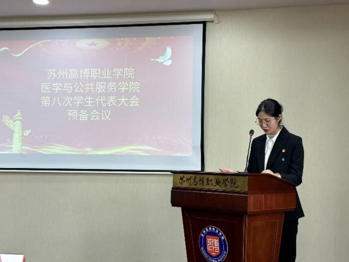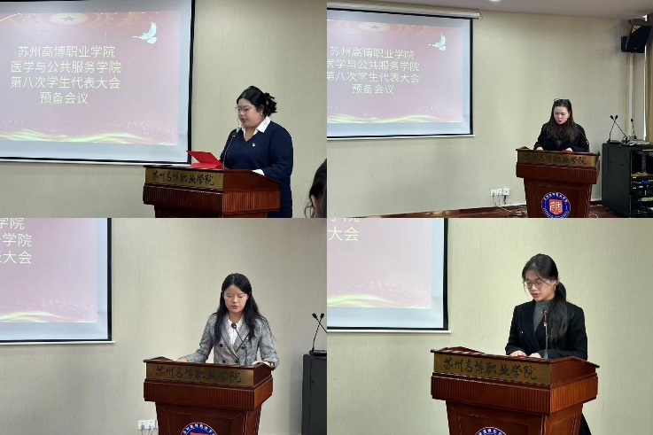 在预备会议中,由医学院分团委书记周红婕老师作大会筹备工作报告;辅导员王雨晨老师宣读代表资格审查报告;辅导员黄璠老师宣读大会主席团、秘书长大会选举工作人员名单;辅导员杨悦艺老师宣读大会选举办法(草案);辅导员邓竹青老师宣读正式会议议程;辅导员徐锦怡老师宣读大会注意事项;辅导员朱嘉丽老师宣读我院学生会主席团候选人简介;辅导员桑云艳老师宣读苏州高博职业学院第八次学代会代表候选人名单。