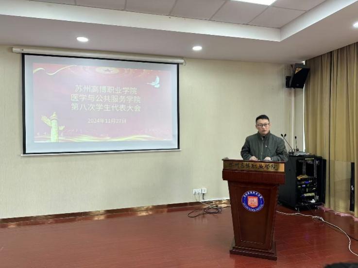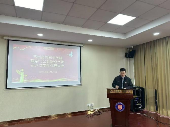 为深化学生干部队伍建设,培养学生的组织协调能力,推进医学与公共服务学院学生组织健康发展,医学与公共服务学院于2024年11月27日下午14:00在行政楼14-215召开第八次学生代表大会。 参加此次学代会的有校团委副书记蒋运奇老师、医学院党总支副书记赵洪鹏老师、分团委书记周红婕老师、学工办副主任张子昕老师、全体辅导员老师代表、全体学生代表参加本次会议,会议由陈妍同学主持。本次大会总结医学与公共服务学院学生会过去一年的工作,选举医学与公共服务学院第八届学生会主席团成员以及出席学校第八次学生代表大会人员名单。