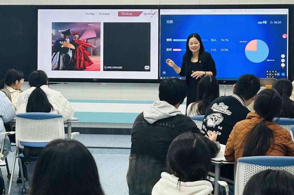 吴晓娟老师让学生制作并展示以中国功夫为主题的海报,锻炼了学生的写作能力,体现了理论联系实际的教学原则,促进了学生全面发展。刘洋老师通过讲解昆曲的历史、地位、特色及代表作等,让学生用英语介绍昆曲,引导学生用英语讲好中国故事。崔红梅老师通过对京剧角色、服饰、声音,妆容等介绍,在听与说的互动中调动学生的感官,使学生更深入地体会到非物质文化遗产的价值。