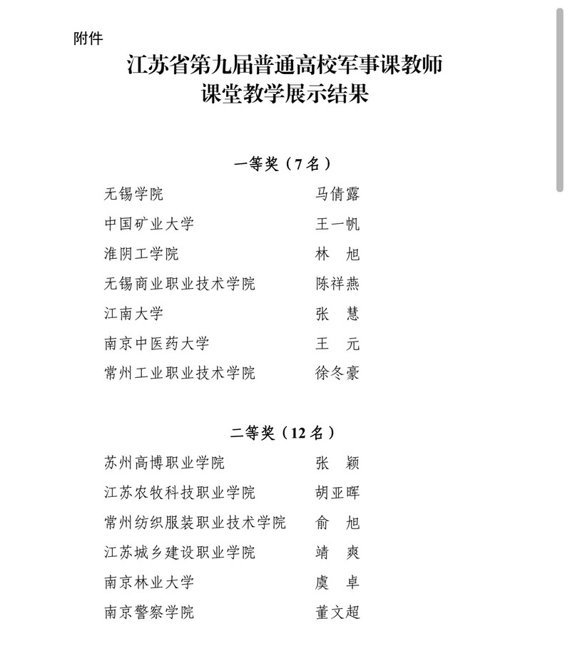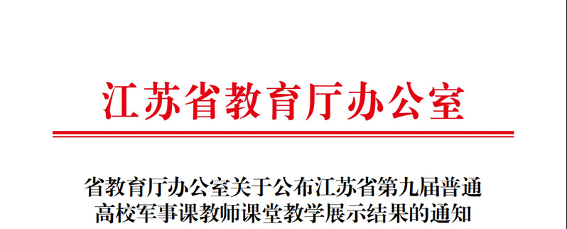 由江苏省教育厅主办、江苏省学校国防教育和军事课教学指导委员会承办的江苏省第九届普通高校军事课教师课堂教学展示竞赛于11月28日-12月1日在南京举行,来自全省各类高校共127名教师参加了比赛。经军地专家视频初评选拔,35名教师入围决赛。我校马克思主义学院教师张颖成功入围决赛,并最终凭借扎实的专业素养和出色的临场发挥获得二等奖。实现了我校军事理论省级教学竞赛获奖零的突破。