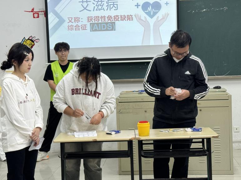 在活动过程中,主持人还介绍了HIV病毒的生成和传播方式,同时展示了HIV试剂盒的使用方法。