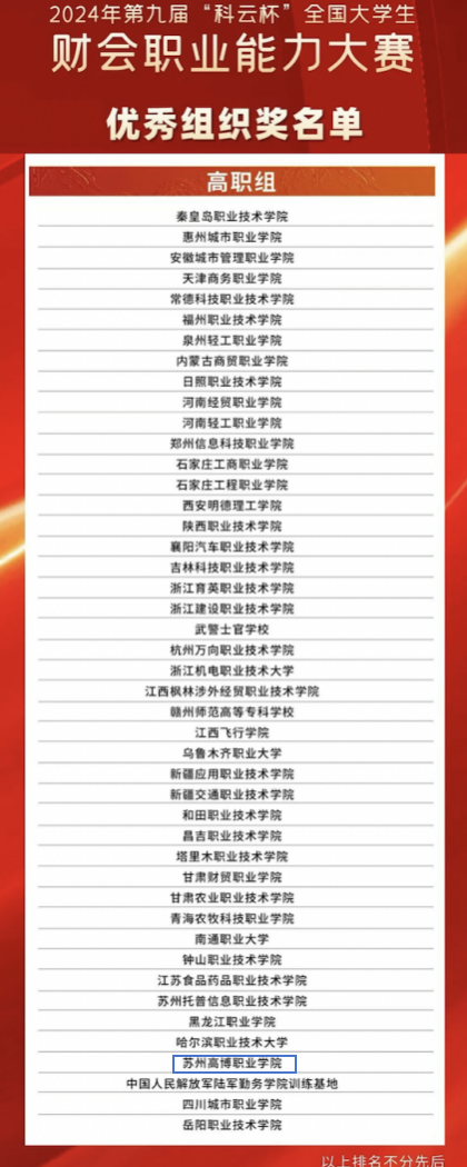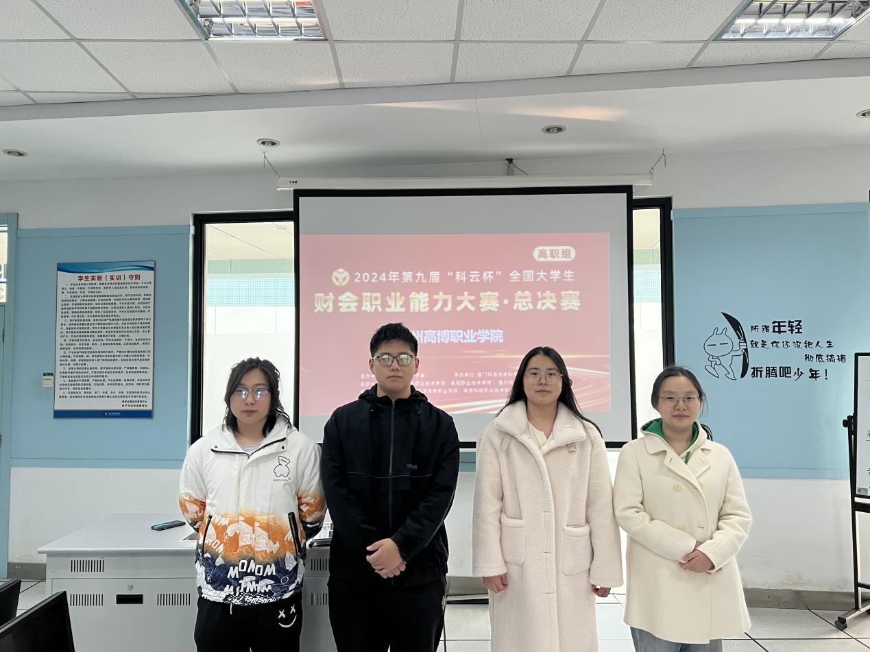 12月7日,2024年“科云杯”全国大学生财会职业能力大赛全国总决赛圆满落幕。我校国际商学院李珂、张婷老师指导的王子睿、蔡奉娟、孙瑜、马雨诺四位同学,获得全国总决赛高职组二等奖,同时,我校还荣获“优秀组织奖”。
