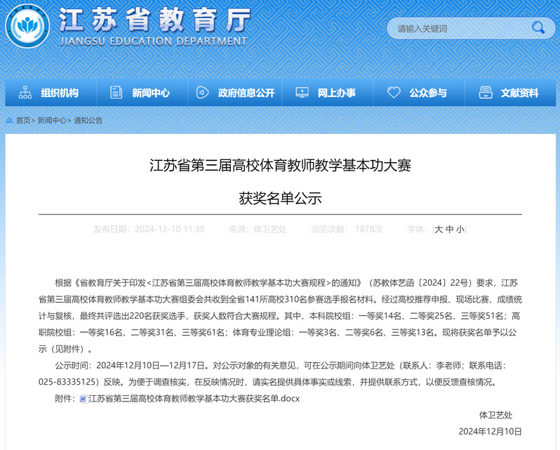 2024年11月22日至24日,江苏省第三届高校体育教师教学基本功大赛在南京信息职业技术学院成功举办。我校体育教师江晓晓、王海洋在此次大赛中表现卓越,分别荣获一等奖和三等奖。