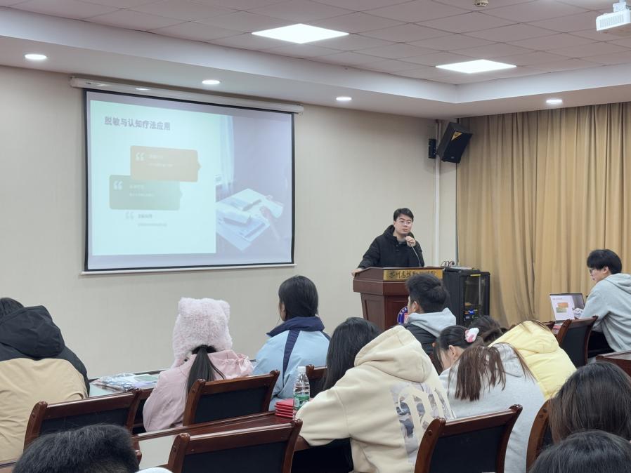 培训伊始,马老师以一些经典的心理学实验为引子,生动地向学生干部们展示了情绪管理与心理防御机制的重要性。他详细解读了“压抑”、“退行”、“投射”等心理应对机制,并引导学生干部们通过具身性体验、支持性环境、共情性关系以及成长性思维来实现自我赋能。这些方法不仅能够帮助学生干部在面对压力时保持冷静,还能够促进他们在团队中发挥更大的作用。