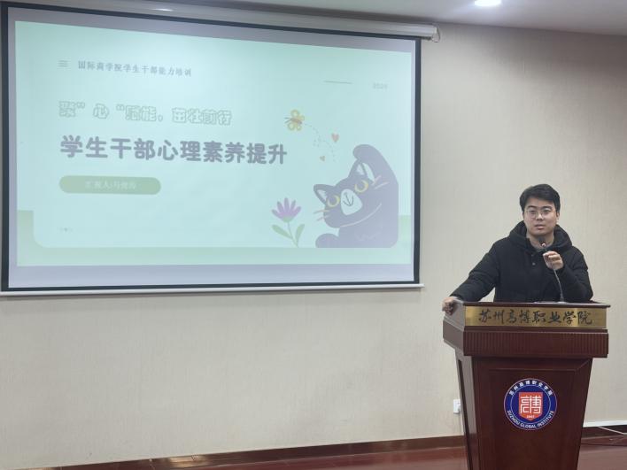 为进一步提升学生干部的心理素质和工作能力,12月19日,国际商学院在14号楼215会议室举办了学生干部专题培训第五课。此次培训以“聚‘心’赋能,茁壮前行”为主题,旨在通过专业指导和案例演示,帮助学生干部在面对挑战时能够更好地自我赋能、调整心态,以更加积极的姿态面对未来的工作和学习。此次培训由国际商学院学生党支部书记马俊涛老师主讲。