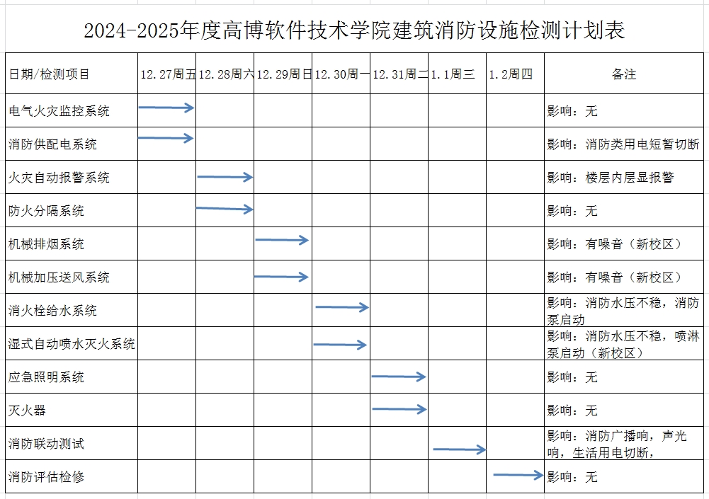 学校各单位:根据上级部门工作要求及校园消防安全工作安排,保卫处将在2024年12月27日—2025年1月2日组织进行消防设施年度检测,期间会有楼宇内声光层显等设备报警、电梯迫降、消防广播、消防卷帘动作、短时间断电等情况发生。在检测期间保卫处现场会安排工作人员,请勿担心。具体计划及影响详见附表,请广大师生知晓并转告。如有特殊情况不适宜安排检测的时段和场所,请及时联系保卫处0512-68836122。安全保卫处 2024年12月27日