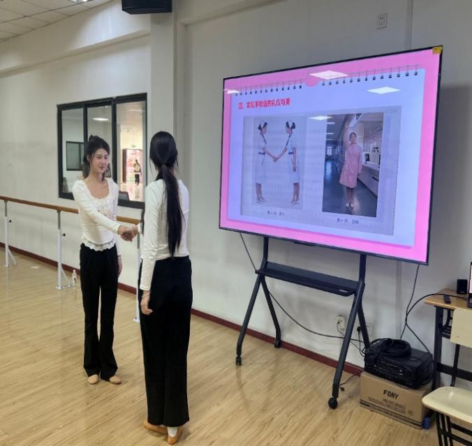 与之相衔接的是“护理礼仪与形体训练”的模块,作为护理专业的学生,护理礼仪是必不可少的一种职业礼仪,是护理人员素质、修养、行为、气质的综合体现,因此在教学过程中,黄琬捷老师首先通过基本姿态与柔韧性训练、身体协调性训练等引导学生塑造优美的身体形态,而后再重点围绕护士的仪表礼仪和工作礼仪进行讲授和实操。学生在结课时分组展示了常见站姿礼仪、坐姿礼仪、手势礼等,充分体现了护士工作中举止礼仪的美,也直观地理解了护理礼仪的重要性,在未来的学习、实践、乃至工作中,学生们都能更加注重自身的礼仪修养,以良好的职业形象、亲切的语言、优雅的举止为患者提供优质的护理服务。