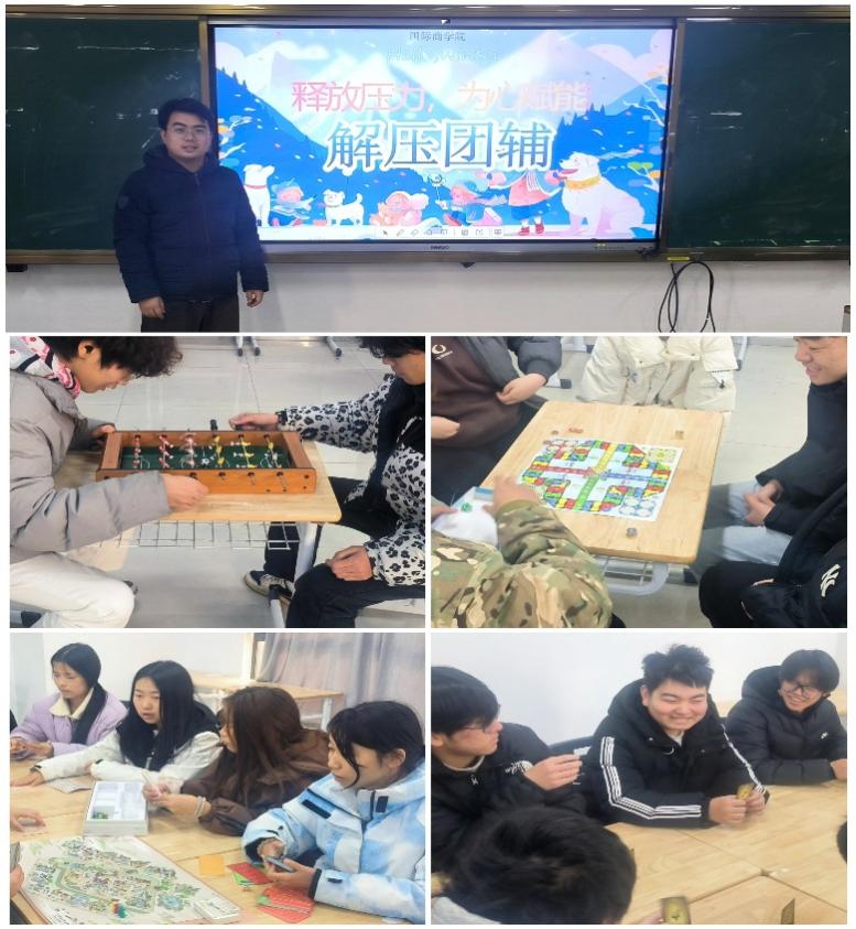 为了帮助学生更好地应对学业和生活中的压力,提升心理素质和自我调节能力,国际商学院于12月24日和26日分别举办了两场别开生面的团辅活动——“释放压力、为心赋能”解压游戏团辅和“自我舒压力,调整新节奏”音乐疗愈团辅。此次活动由国际商学院心理辅导员马俊涛老师主讲,分别吸引了三十余同学积极报名参与。活动内容丰富,形式多样,为同学们提供了一个轻松愉悦的心理调适空间,取得了良好的效果。