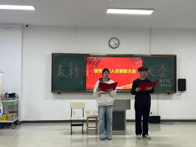 为激励全体成员追求卓越,进一步推动艺术团的蓬勃发展,医学院于12月20日在12-107举行学院艺术文化系列活动表彰大会。参加此次表彰大会的有医学院分团委书记周红婕老师、学工办副主任张子昕老师、辅导员吕瑞晗老师、刘宇老师、桑云艳老师及各获奖同学。本次大会由朱学坤和陈雨榕同学主持。