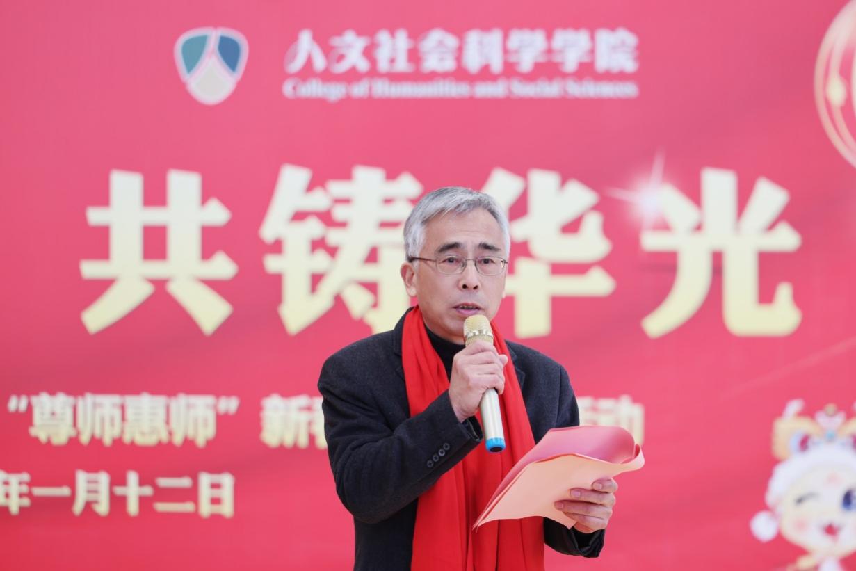 自人文学院建院以来,学院教职工始终像家人一样团结友爱,相互关怀,相互扶持。团拜会上,全体教职员工在音乐伴奏下,共同高歌《相亲相爱一家人》,用歌声传递了团结一心、携手共进的决心和信念。校特聘教授洪庆福老师深情演绎的英文歌曲《You Raise Me Up》则将现场氛围烘托得更加浓郁。