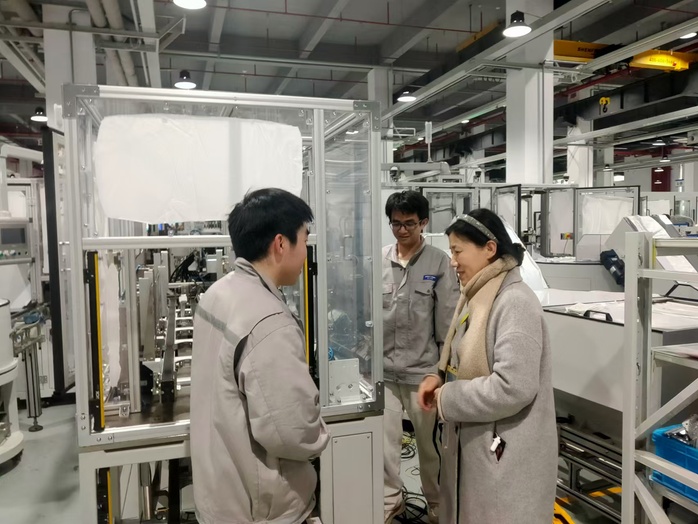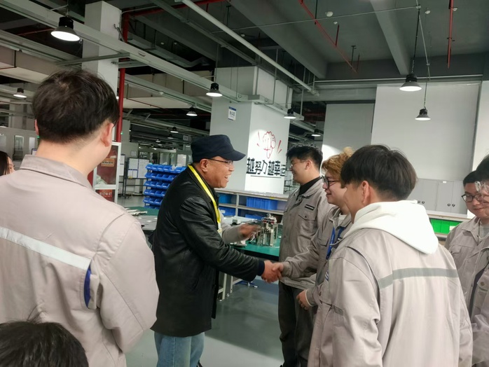 座谈会结束后,在李星总监等人的陪同下,高博职业学院一行实地参观了企业智能化生产车间,观摩了高速精密装配线、工业机器人协作系统、数字化管理平台等先进设备与技术的应用场景。在生产车间,一行人看望了正在工作的学生,并与学生们进行了简短交流。经过四个月的岗位实习,学生们已能够独立按照图纸要求进行配线安装和简单调试,精神面貌也焕然一新。