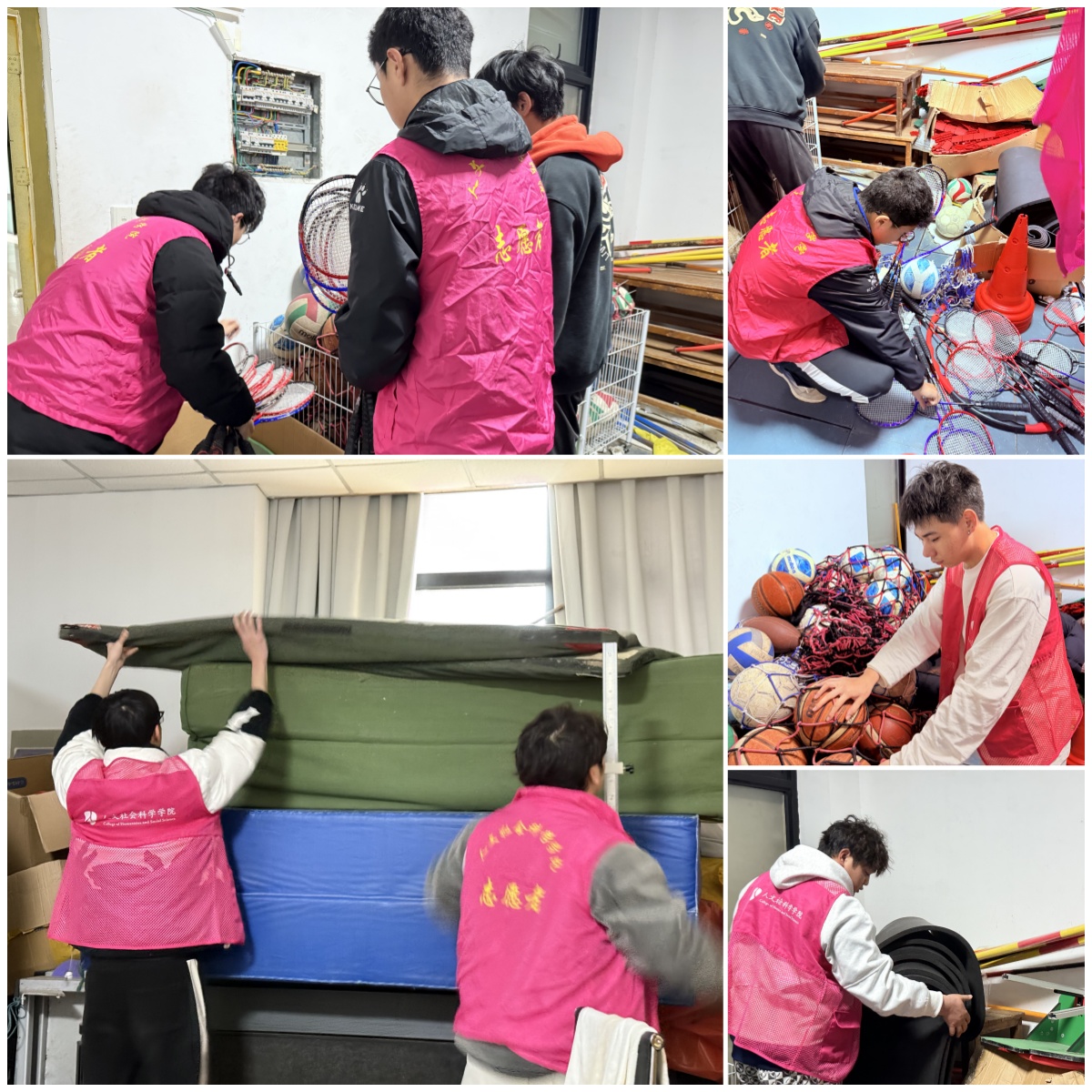 活动当天,志愿者们首先来到器材室。这里长期缺乏整理,器材杂乱堆积,地面也满是灰尘。面对这一情况,同学们迅速行动起来。有人负责整理器材,将体育用品、教学道具分类摆放;有人拿起清洁工具,认真清扫地面、擦拭货架。尽管空间狭小、灰尘呛人,大家却毫无怨言,齐心协力让器材室变得整洁有序。