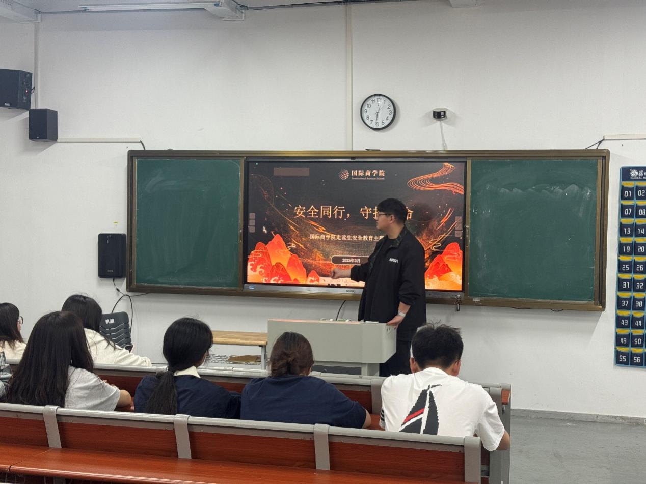为了全面提升走读生的安全防范意识,切实保障学生人身财产安全,国际商学院分团委于2025年3月26日中午12点30分在北校区32号楼114教室召开全体走读生安全教育主题班会。本次班会由国际商学院吕林峰老师主讲,通过系统讲解和互动演示,全方位提升学生的安全素养与应急能力。