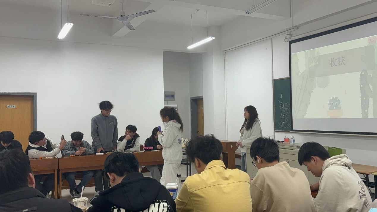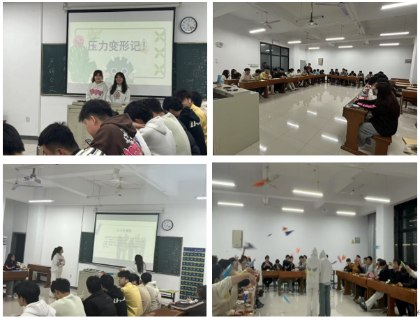 活动突破传统说教模式,将抽象压力转化为可视化、可交互的具身体验。在“压力光谱图”、“压力纸飞机”环节中,不同颜色、各式各样的的纸飞机被赋予学业竞争、人际关系、情感等压力的具象化标签。“压力光谱图”让大家初步了解了自己的压力和压力值,大家把自己心中的压力或烦恼写在“压力纸飞机”上,标上专属标记然后折成纸飞机,随机传递给另一个人,同学们集思广益,头脑风暴,全面剖析压力产生的原因、表现及影响,然后发挥同伴的力量传授有效应对压力的策划和方法。同辈主持人指出:让压力“被看见”是本次团辅活动的第一步,循序渐进,引导大家思考,让大家认识到并非所有压力都需要对抗,有的压力可通过倾诉、沟通化解,有的压力则需要认知升维,从认知减压到心理减负。