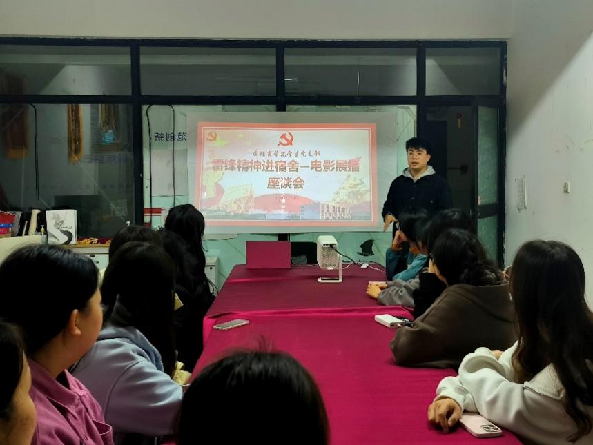 为深入贯彻习近平总书记关于弘扬雷锋精神的重要指示精神,扎实推进社会主义核心价值观教育,国际商学院学生党支部于3月31日18时30分到20时30分在学生宿舍6号楼开展“雷锋精神进宿舍”电影展播及座谈会活动。本次活动覆盖大一大二学生群体,二十余名青年学子齐聚一堂,通过理论学习、影视教育、座谈研讨等形式,深刻感悟雷锋精神时代价值,筑牢理想信念根基。