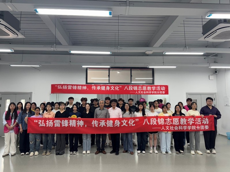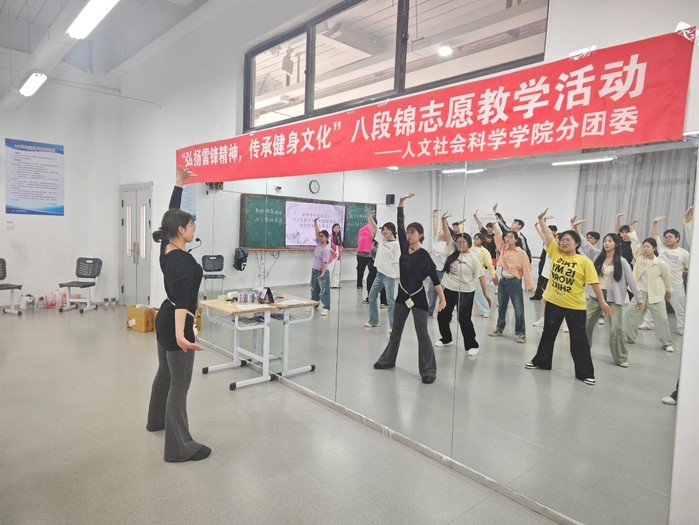 为弘扬雷锋精神,践行志愿服务理念,3月26日下午,人文社会科学学院分团委在32号教学楼101室举办了八段锦志愿教学活动。校长助理、人文社会科学学院院长黄兴,校长助理、人文社会科学学院党总支书记吴建明,人文社会科学学院副院长马亚丽、办公室主任侯宇晨、学工办主任赵雪飞等出席活动。本次活动作为学院“传承雷锋精神,争做时代先锋”系列活动的重要组成部分,吸引了全校30余名师生参与,2383班休闲体育专业王晓雯担任教练。