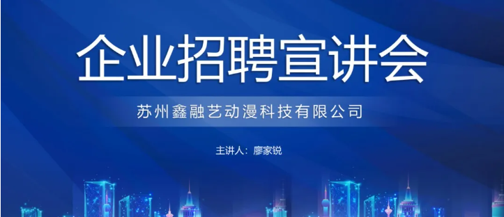 宣讲会与会嘉宾有苏州鑫融艺动漫科技有限公司总经理熊城慰、项目管理副总经理廖家锐。艺术与建筑学院副院长张斌、党总支副书记纪冰心,新媒艺工作室教师参加会议。此次招聘宣讲会面向影视动画和数字媒体艺术设计专业的学生。新媒艺工作室主任韩美英主持宣讲会。