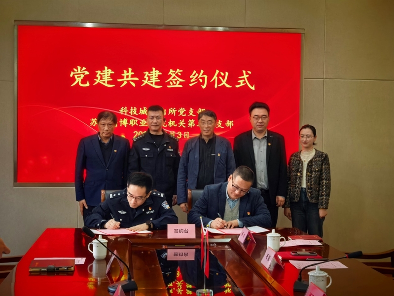 为了深入学习宣传贯彻党的二十大精神,深化党建引领基层治理创新,推动警校共建共治共享,4月3日上午,苏州高博职业学院机关二支部与苏州科技城派出所党支部在学校行政楼会议室举行党建共建签约仪式。苏州高博职业学院常务副校长张建初,副校长邹学海,苏州科技城派出所所长丰昊、教导员徐威及支部党员代表,党工部副部长、机关总支副书记程前,机关二支部书记张红及支部全体党员出席签约活动。