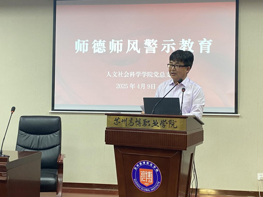 4月9日,人文社会科学学院在行政楼215会议室召开全体教师大会,聚焦师德师风建设,通过观看警示教育片,为全体教师上了一堂生动且深刻的师德师风教育课。校长助理、院党总支书记吴建明主持会议。