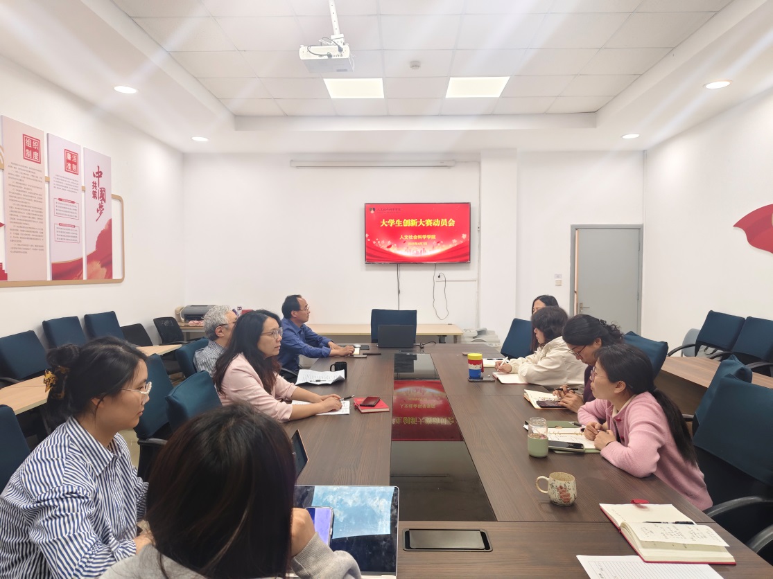 为了积极推进今年大学生创新大赛备赛工作,提升教师指导大学生创新大赛的能力和水平,人文社会科学学院于4月7日下午召开大学生创新大赛动员会,学院副院长兼马克思主义学院院长吴歧范、学工办主任赵雪飞、特聘教授洪庆福、专业外语教研室主任张凤以及部分指导教师参加了会议。会议由学院副院长马亚丽主持。