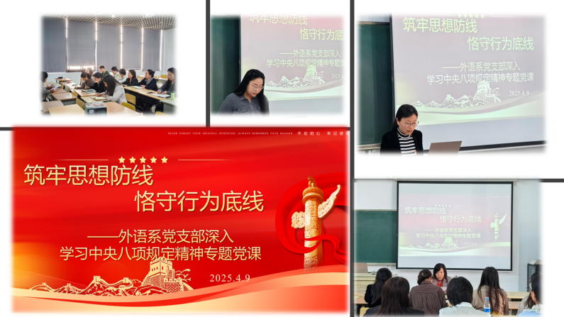 为深入贯彻落实中央八项规定精神,加强党员教师作风建设,4月9日,人文社会科学学院外语系党支部召开以“筑牢思想防线 恪守行为底线”为主题的专题党课。会议由组织委员刘秀娥主持,全体党员教师参会,通过理论学习、视频学习与交流研讨相结合的方式,进一步强化纪律意识,筑牢思想根基。