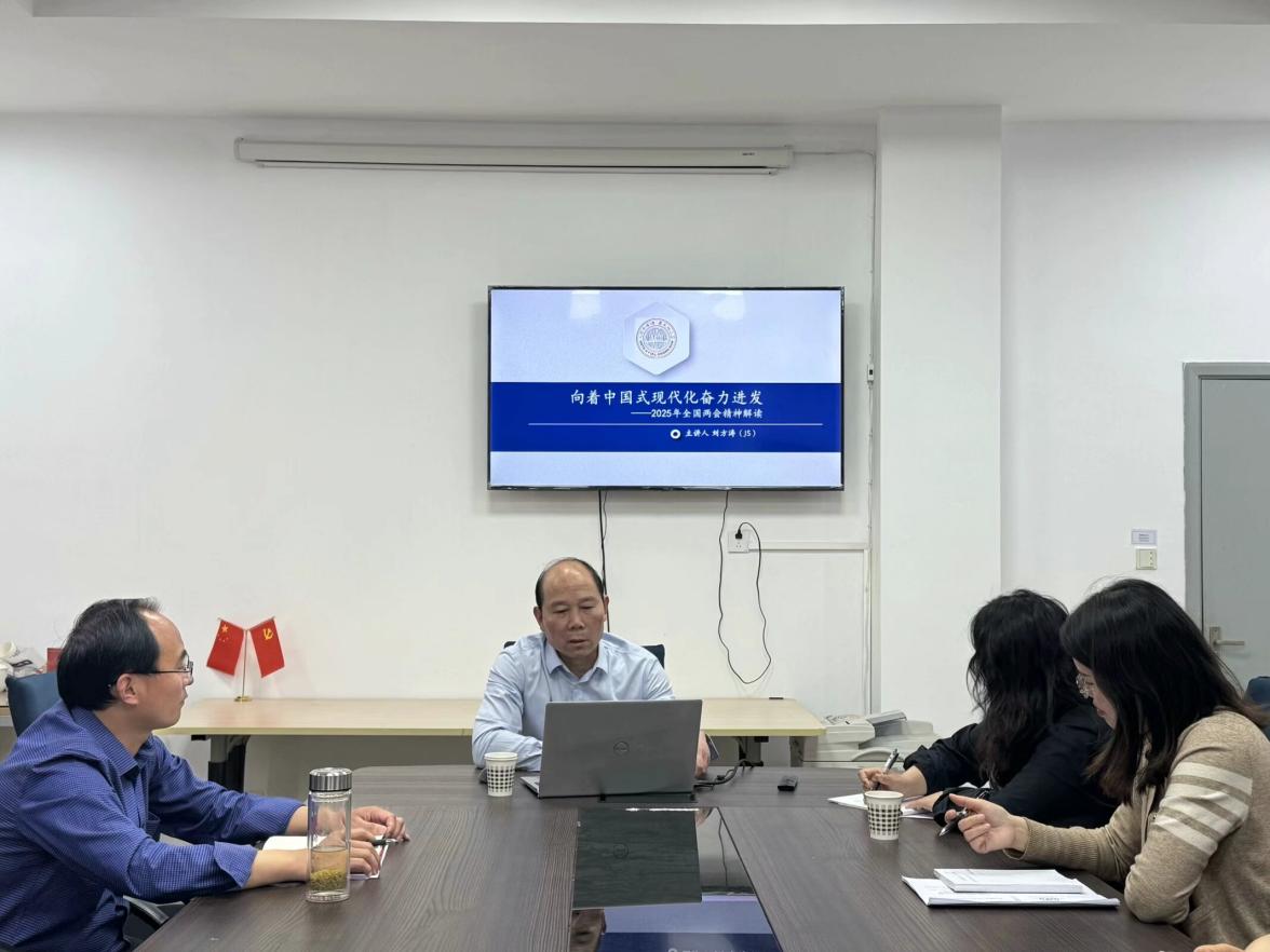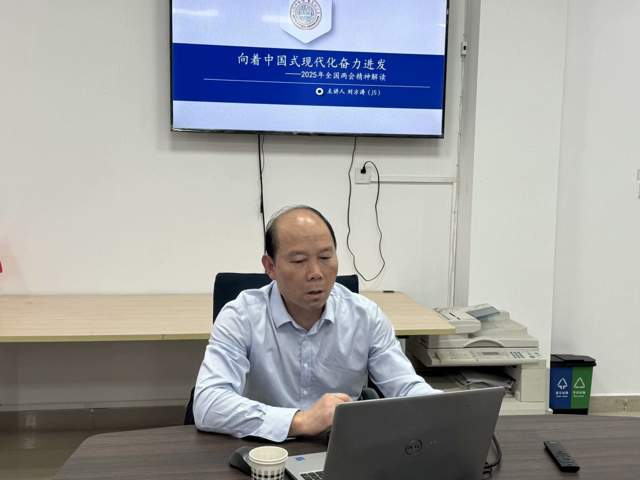 为进一步学深悟透2025年全国两会精神,推动“形势与政策”课程改革创新,提升思政课育人实效。2025年4月9日下午,我校马克思主义学院邀请苏州大学马克思主义学院刘方涛教授来校,以“向着中国式现代化奋力进发”为主题为全体思政教师作了一场内容丰富、思想深刻的专题讲座。马克思主义学院院长吴歧范及全体思政教师参加了此次学习研讨活动,活动由形势与政策课程负责人孙依晨主持。