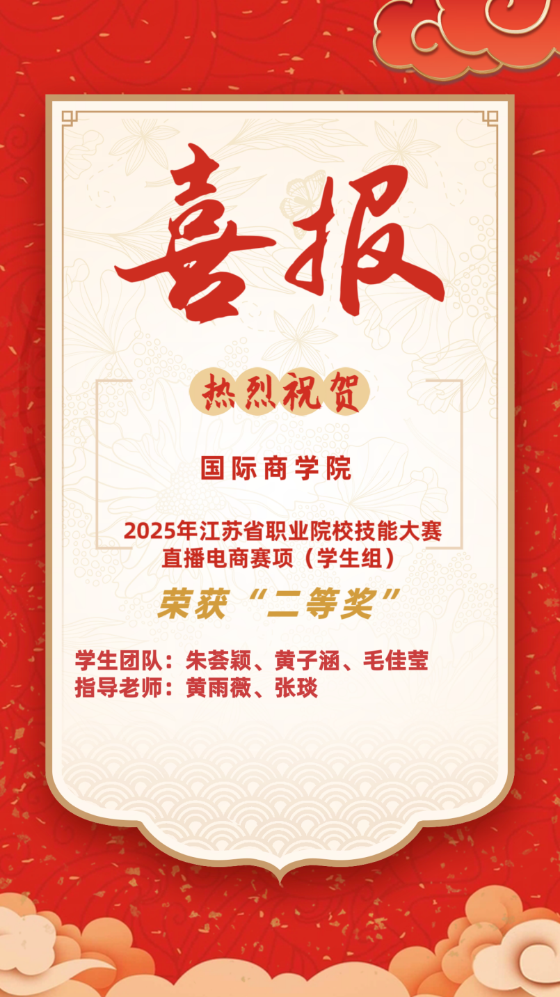 4月12日—14日,2025年江苏省职业院校技能大赛(高职组)直播电商赛项在扬州工业职业技术学院成功举办。该赛项共有来自省内的54支参赛队同台竞技。经过展示讲解和直播策划等环节的激烈角逐,由国际商学院黄雨薇和张琰两位老师指导的朱荟颖、黄子涵、毛佳莹三位同学组成的参赛团队荣获二等奖,创造了学校在此赛项的最好成绩。