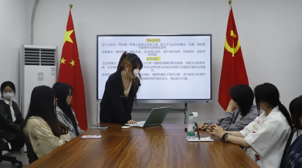 任启跃同学以秀米平台为操作载体,现场向大家操作和介绍公众号排版的基本流程、图文制作技巧以及版式设计等内容。她结合自身视觉传达设计专业,不仅详细分享了自己的操作技巧与心得感悟,也给大家分享了团队间如何正确配合从而提高工作效率的方法。