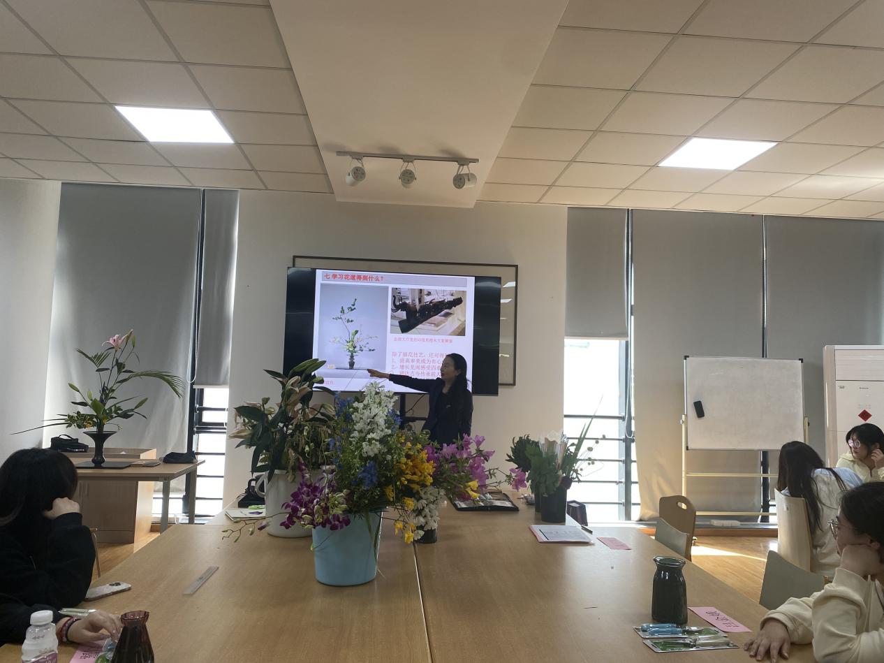 本次活动邀请池坊花道教授罗桂莲女士作为主讲嘉宾,罗教授在花道领域造诣深厚,在苏州、厦门、桂林等地都开设了池坊花道课程,拥有丰富的教学与实践经验,对花道文化有独特深刻的见解。罗教授把池坊花道的发展历史与不同时期的插花技艺相结合,详细介绍了该流派的三大基本花型:立花、生花、自由花。立花是花道最古老的样式,以多种多样的草木来表现大自然的风景。生花是18世纪的样式,使用1~3种花材,表现出草木扎地生根并努力向上生长的姿态。自由花是从不同的观点来发现草木的美,并恰如其名地可进行自由创作的作品。罗教授表示插花不仅是对花卉的简单组合,更蕴含着“天、地、人”和谐统一的哲学思想。在插花过程中,需遵循“真、善、美、圣”的理念,尊重每一枝花材的自然形态,赋予其新的生命力。通过学习、体验插花技艺,可提高审美成为有心之人,增长见闻感受四季之变,通达古今传承前人之心,修炼心性绽放生命之花。