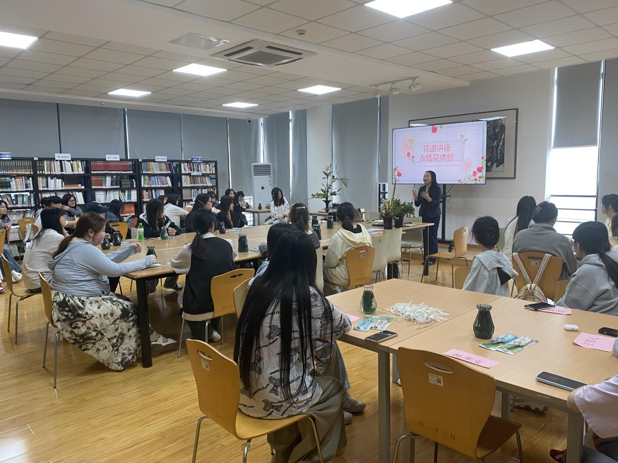 四月春光烂漫,书香花语交融。为迎接4.23世界读书日的到来,丰富师生的文化生活,提升艺术修养和审美情趣,领略花道文化的独特魅力,4月16日下午,一场精彩的花道讲座与插花体验活动在图书馆四楼文教/艺术图书阅览室拉开帷幕,吸引众多花艺爱好者前来参与。活动由图书馆馆长钦春英主持,40余名师生齐聚一堂,沉浸式体验花道文化之美。
