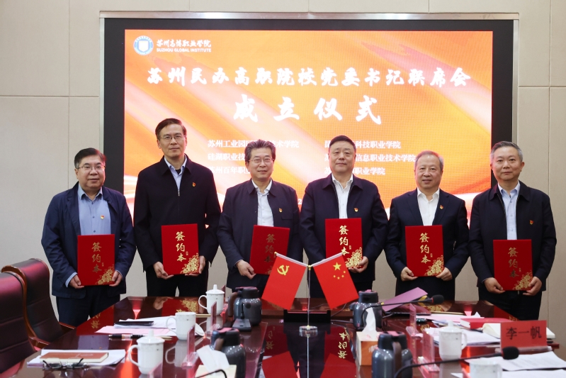 最后,六所民办高职院校的党委书记共同签署了合作协议。这一签约仪式标志着苏州民办高职院校在党建工作领域开启了新的征程。未来,各校将依托党委书记联席会这一平台,在党建资源共享、党建活动共办、党建经验互鉴等方面开展全方位合作,推动党建工作与教育教学、人才培养、社会服务等工作深度融合,以高质量党建引领学校高质量发展。