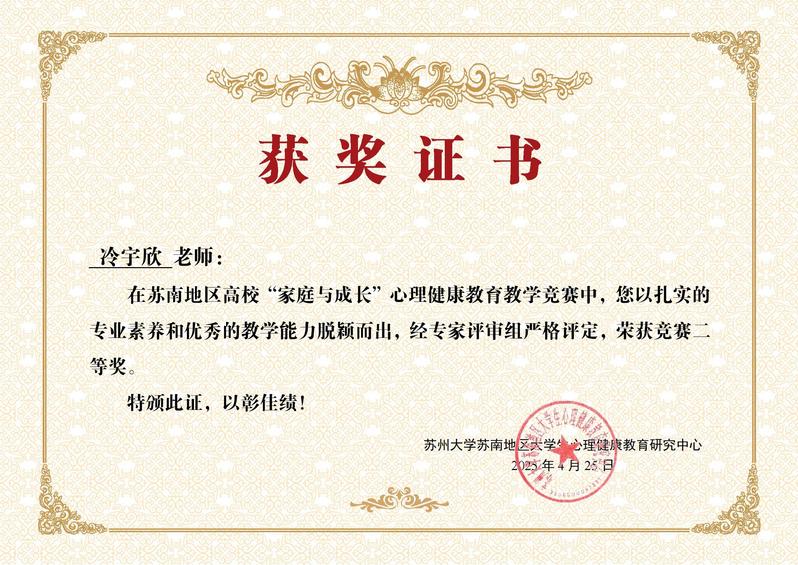 2025年4月23日,江苏省教育厅委托省大学生心理危机预防与干预研究中心举办的全省高校“家庭与成长”心理健康教育教学竞赛苏南地区复赛在苏州大学圆满落幕。本次竞赛旨在深入贯彻落实《全面加强和改进新时代学生心理健康工作专项行动计划(2023-2025)》文件精神,推动家校协同育人,促进学生心理健康发展。经过激烈角逐,我校心理健康中心教师冷宇欣凭借课程《情绪油门vs理性刹车:基于脑科学的亲子沟通调频术》荣获二等奖。