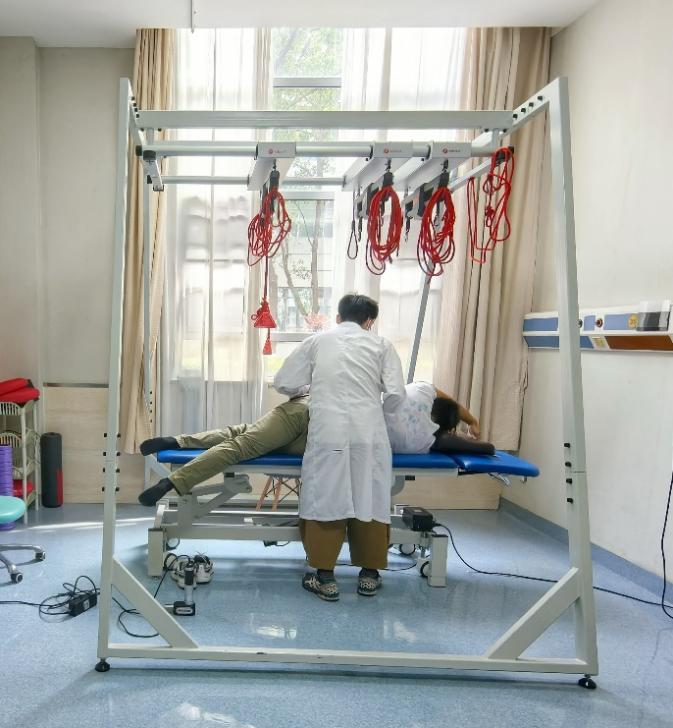 在悬吊室,调研团队观摩了治疗师为腰椎病患者进行关节松动术和肌力训练的操作。带教治疗师强调,科室注重“理论+实践”结合,实习生需通过严格考核方可独立操作,确保治疗规范性和安全性。