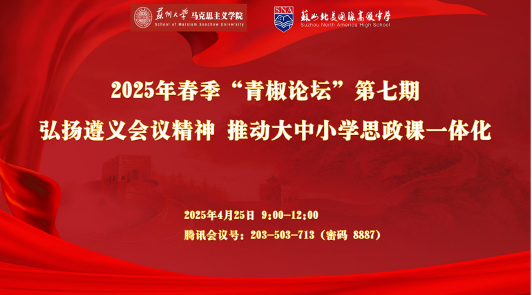 在党的二十届三中全会精神指引下,为纪念遵义会议胜利召开90周年,一场跨越省域、跨越学段、融合课堂与思想的教育盛会——第七期“青椒论坛”之“弘扬遵义会议精神,推动大中小学思政课一体化”于2025年4月25日在苏州北美国际高级中学成功举办。此次论坛由苏州大学马克思主义学院发起,汇聚来自全国各地近百所大中小学及相关单位的教育工作者和专家学者齐聚云端与线下,共同探讨新时代思政教育的创新路径,推动大中小学思政一体化建设。我校马克思主义学院院长吴歧范应邀参会并担任点评嘉宾。