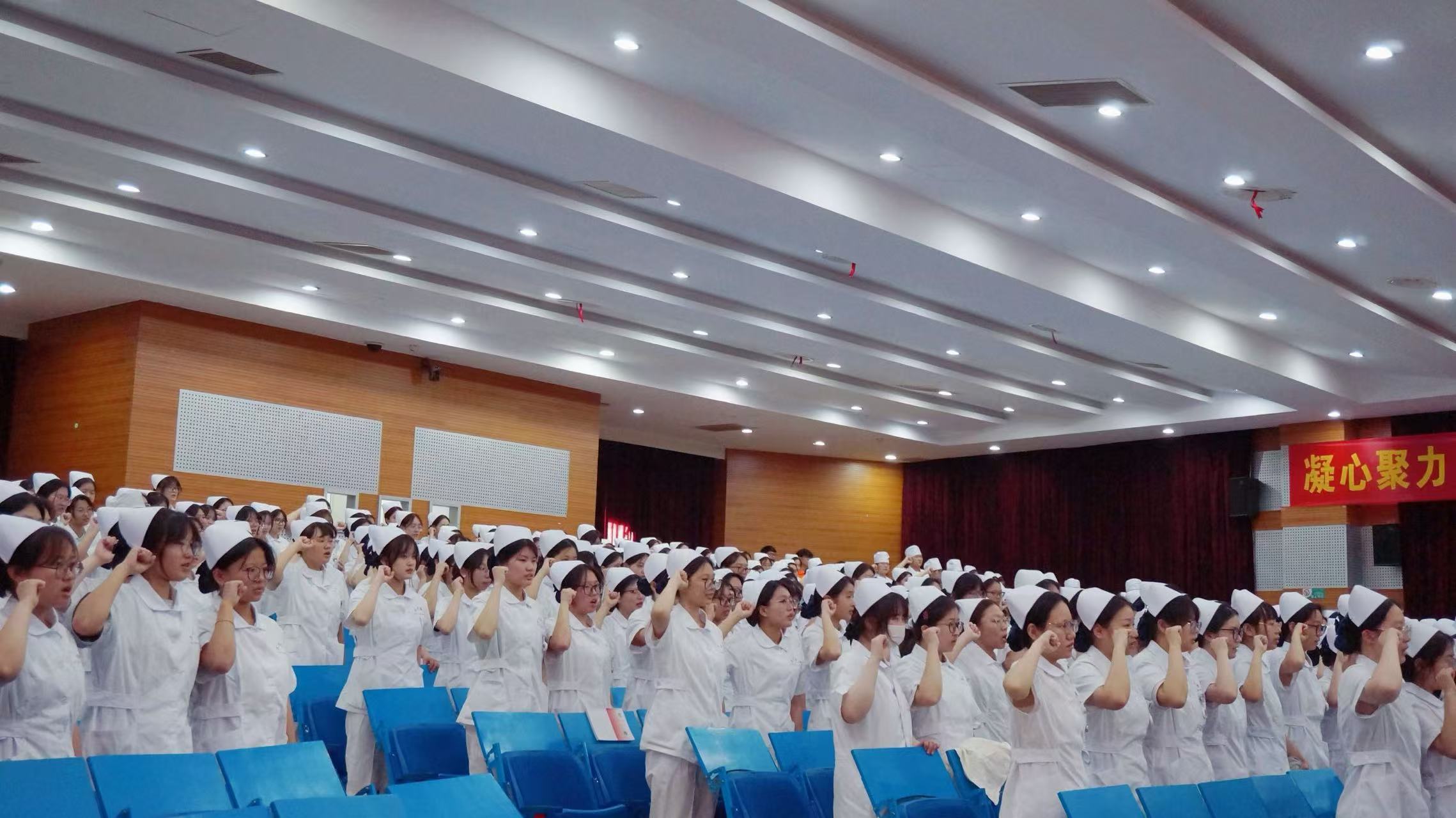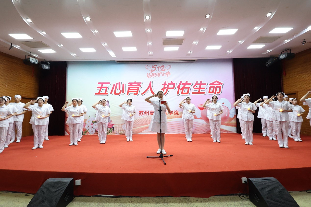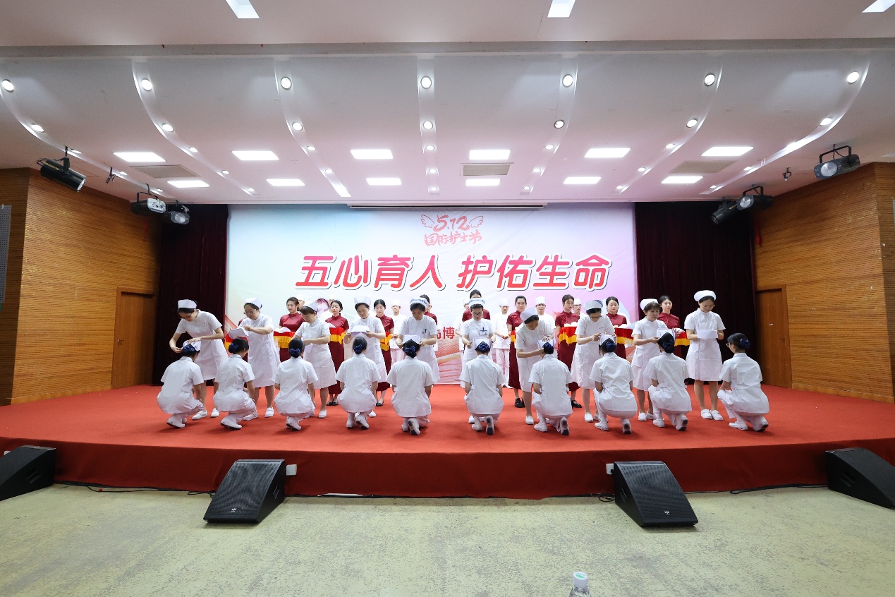 在护理前辈们的注目下,同学们迈着整齐而坚定的步伐,上台接受护理前辈的授帽,并点燃象征奉献精神的蜡烛,表达了他们对护理前辈的无限崇敬,点点烛光象征了他们献身护理事业的决心。授帽仪式后,护生们举起右手,进行了庄严的宣誓。在铮铮誓言中表达了自己不辱白衣天使神圣使命,她们青春的脸上写满了自豪和骄傲,那激荡人心的南丁格尔誓言将激励学生为护理事业奋斗终身。