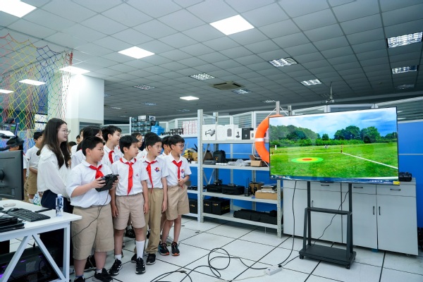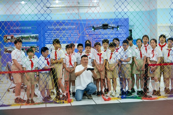 在实训楼无人机展示区,机电工程学院的专业老师化身为科技引路人,生动讲解无人机在现代农业、应急救援等前沿领域的广泛应用。随着老师一声令下,无人机如灵动的飞鸟,精准完成起飞、悬停、降落的全套操作,同学们的惊叹声此起彼伏,目光紧紧追随空中的“小精灵”。随后的模拟飞行操控与户外长距离飞行演示,以“理论讲解—模拟操作—实机验证”的创新学习链,为同学们打开了“科技+职业”融合的智慧之门。当同学们亲手操控模拟设备,看着虚拟无人机在屏幕上翱翔时,眼中闪烁着兴奋的光芒,智能科技的种子已在心中悄悄发芽。