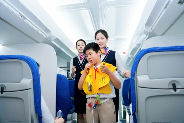 飞机模拟舱内,国际商学院空中乘务专业的学生摇身一变,成为专业的“职业讲师”。她们身着整齐的制服,微笑着为同学们演示救生衣穿戴技巧和模拟乘务服务。“救生衣充气时要注意听到‘咔嗒’声哦!”随着讲师的细致指导,同学们认真模仿,从一开始的手忙脚乱到逐渐掌握要领,在实践中深刻体会到机舱服务的严谨规范。当同学们作为“小乘客”接过饮料品尝时,一句清脆的“请慢用”让模拟客舱瞬间充满真实的服务氛围,仿佛真的置身于万米高空的客舱,云端职业梦想正在悄悄绽放。