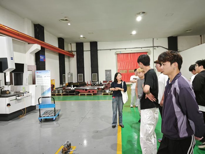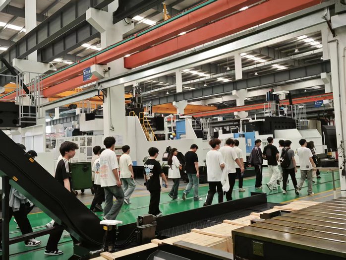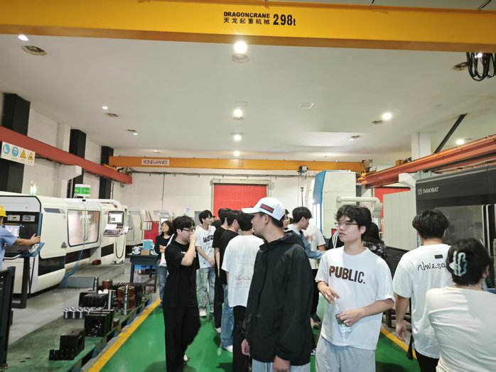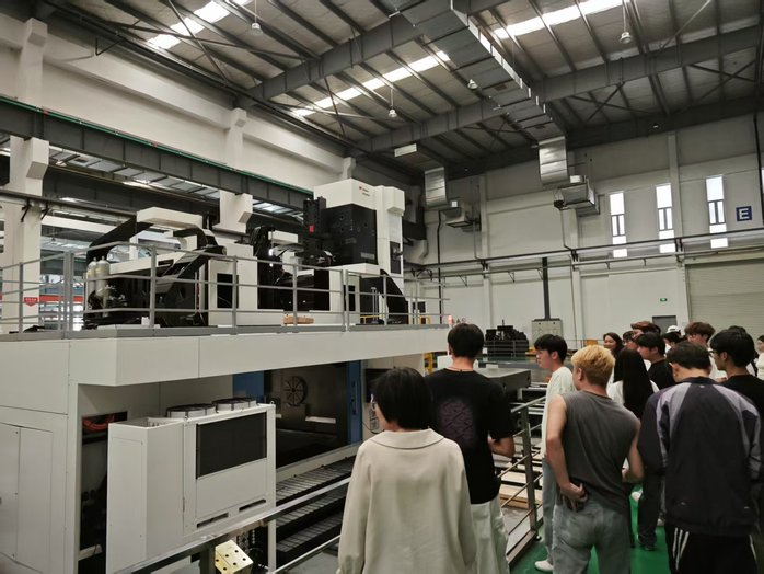在生产车间,AGV 无人搬运车沿着规划路径精准运送物料,五轴联动加工中心正在加工高精度的滑座底板,智能数控车床快速完成主轴套筒的精密切削。黄老师跟大家说:五轴联动设备通过多轴协同,加上高精度伺服电机和先进控制系统,能大幅减少复杂零件的自动化加工时间,提高生产效率。大家目不转睛地观察设备运行,不时用手机拍摄关键环节。