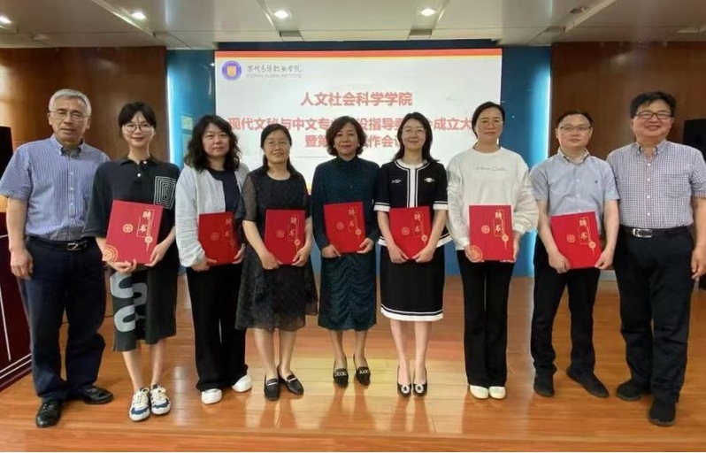 现代文秘和中文专业建设指导委员会首届成员是:苏州光福镇党委委员、人大副主席吴亚奇,苏州科技城东渚街道党政办主任潘孝辉,太仓市城厢镇总工会主席徐唯来,上海黄浦建筑设计有限公司董事长郁琳,苏州大学文学院副教授、硕士生导师倪祥妍,苏州科技大学文学院副教授、硕士生导师徐文,我校人文学院人文教研室主任、现代文秘专业负责人杨曦,我校人文学院中文专业负责人胡微。黄兴和吴建明分别为他们颁发了聘书。