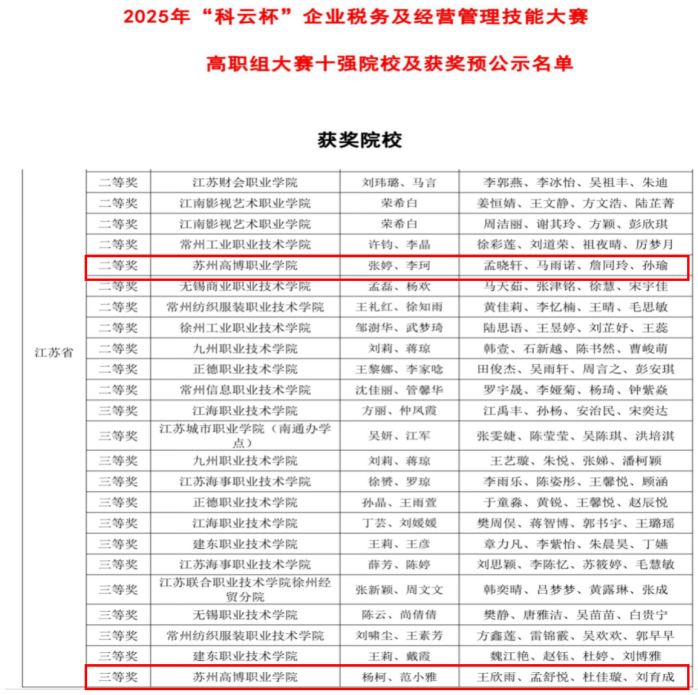 5月24日,由中国商业会计学会主办,厦门科云信息科技有限公司、秦皇岛职业技术学院等联合承办的2025年“科云杯”企业税务及经营管理技能大赛圆满结束。国际商学院来自大数据与会计专业的两支学生团队成员分别为苏州高博1队的孟晓轩、马雨诺、詹同玲、孙瑜,苏州高博2队的王欣雨、孟舒悦、杜佳璇、刘育成,八位同学在指导老师张婷、李珂、杨柯、范小雅的带领下,在学院的大力支持下,认真训练,积极备战,分别获得了江苏省二等奖和三等奖的好成绩。