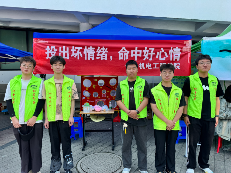为深入贯彻“向阳而生,逐梦扬帆”心理健康主题教育主线,普及心理健康知识,倡导积极阳光的生活态度,5月26日,机电工程学院在学校食堂广场开展“投出坏情绪,命中好心情”525心理健康日主题活动。本次活动以趣味性和互动性兼备的“投投乐”游戏为载体,面向全校师生开放,吸引了众多同学踊跃参与。