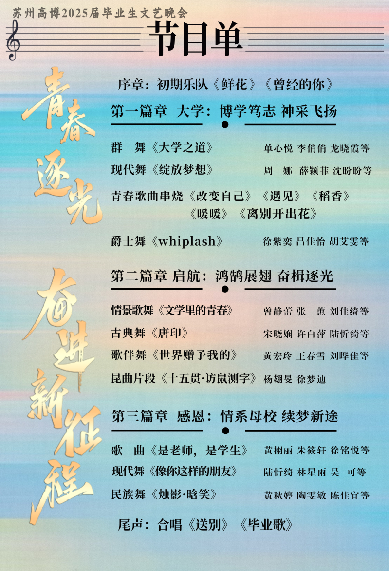 全校师生:为全力营造温暖和谐、生动活泼的毕业氛围,学校定于6月10日(本周二)晚18:30在实训楼报告厅举行“青春·逐光,奋进新征程”2025届毕业生文艺晚会,热忱欢迎广大师生前来观看。学生工作部(处)团委2025年6月9日