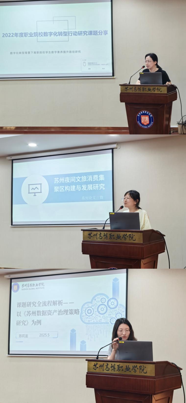 交流会上,许盼、马雪琴、陈莉崟三位教师结合各自研究领域,分享了各自的学术成果。许盼老师对“2022年度职业院校数字化转型行动的研究课题”进行了分享,从课题介绍、研究心得和研究结论三大维度展开,揭示了高职学生数字素养提升的整体思路,并分享了课题写作要点和技巧。马雪琴老师聚焦“苏州夜间文旅消费集聚区构建与发展研究”主题,深入剖析苏州夜间文旅消费集聚区发展现状和夜间消费集聚区的构建,提出保障土地供给、加大经费投入、出台利于夜间消费区建设的政策等策略,并分享了三篇论文成果。陈莉崟老师围绕课题“苏州数据资产治理策略研究”展开论述,通过课题的选题背景与意义、研究目标与核心问题、研究方法与框架、研究过程与关键节点等全流程解析,为教师提供了研究课题详细的思路与参考。